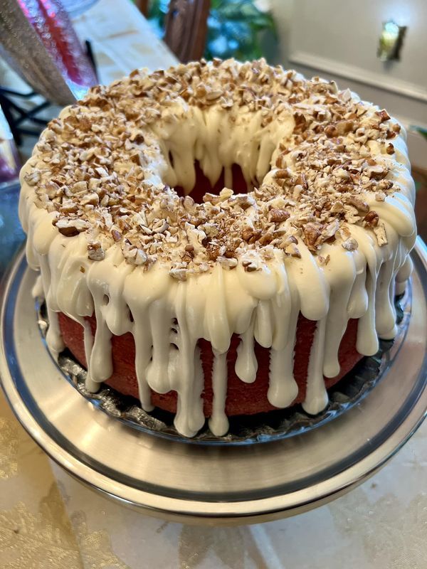 This recipe yields a moist, vibrant red cake with a velvety crumb, topped with a signature cascading cream cheese frosting and crunchy pecans.