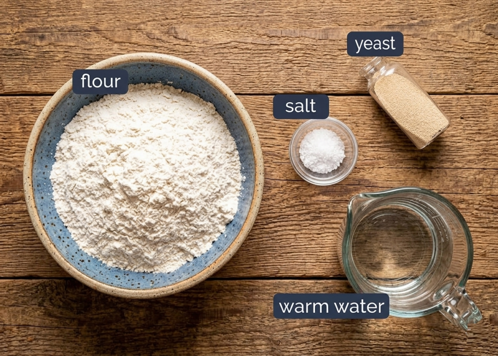 Here’s the full lineup to build this loaf from the ground up—yeast, flour, salt, and water. That’s the whole squad, no extras needed.