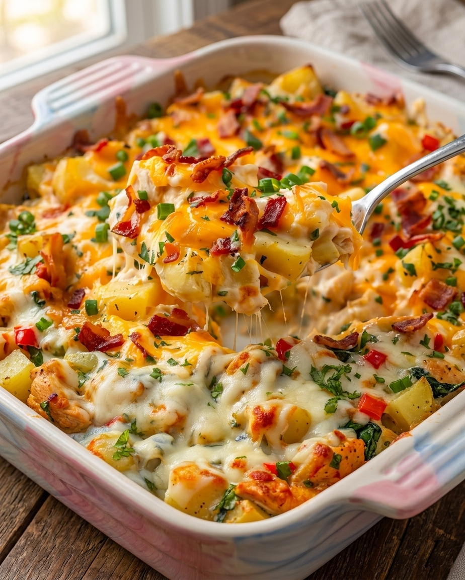 Every bite is packed with tender chicken, creamy potatoes, and gooey melted cheese — a simple combo that delivers pure satisfaction.